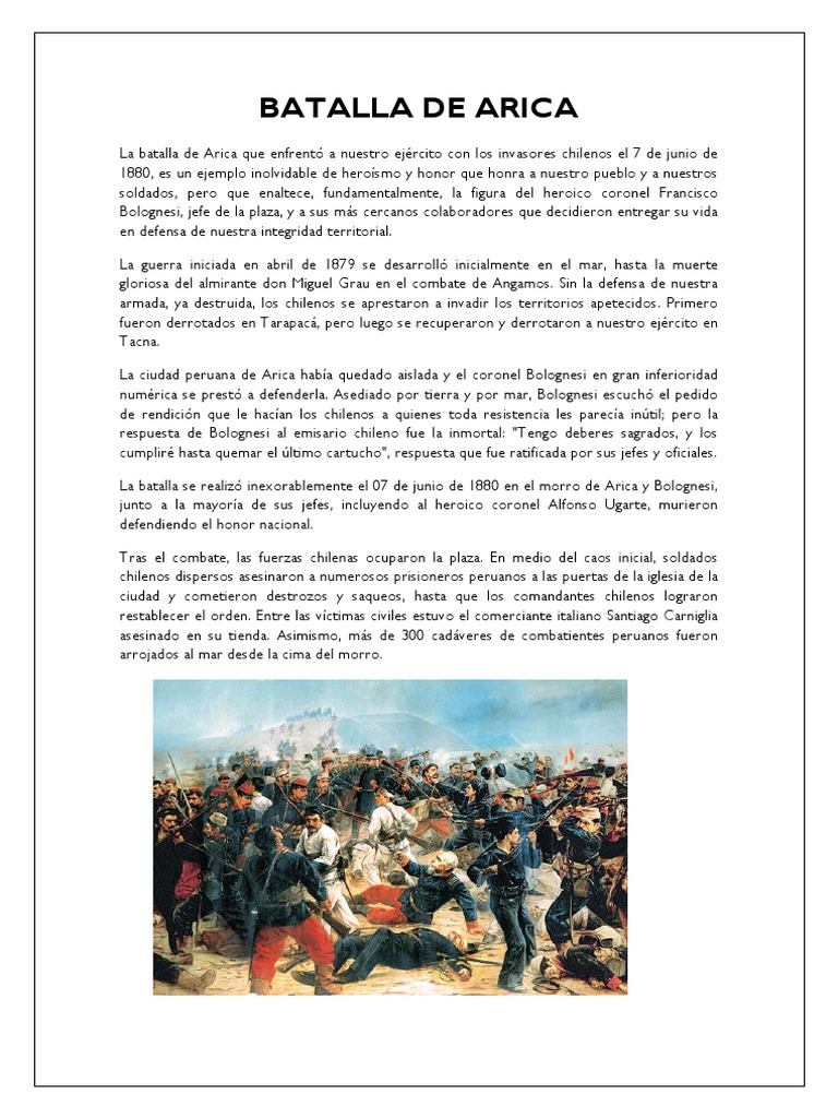 (28) página 1 de 1. La batalla de arica, también conocida como el asalto y toma del morro de arica, enfrentó a la república peruana contra la república de chile en el sur del perú y se llevó a cabo en la ciudad de arica en junio de 1880. Fue declarado monumento nacional el 6 de octubre de 1971. Después de la victoria en la batalla de tacna, el 26 de mayo de 1880, el mando chileno tomó la decisión de capturar la plaza fortificada de arica, con la finalidad de asegurar la línea de. Chile vence en batalla de arica.jpg 400 × 278;